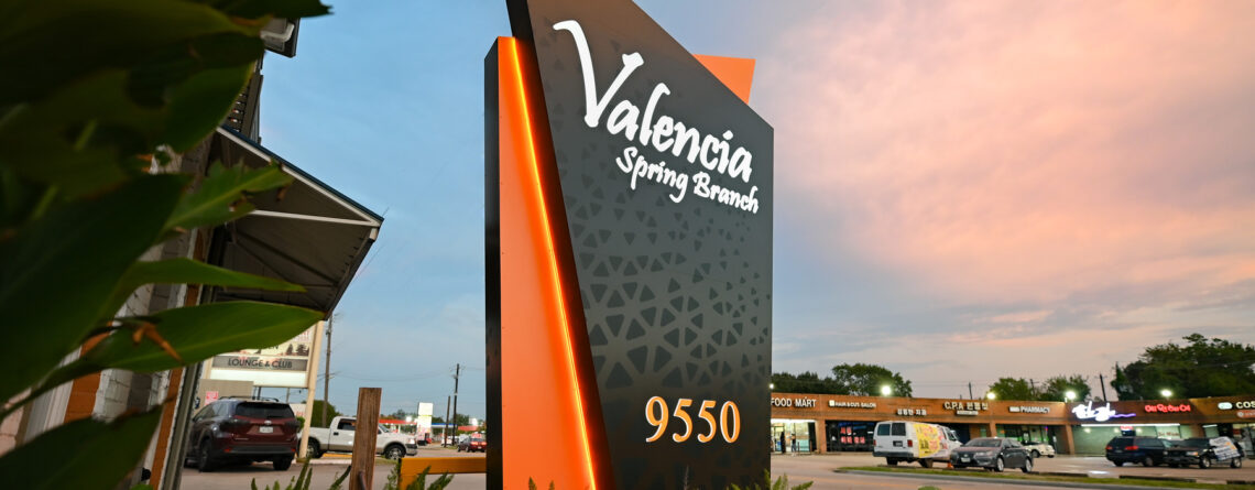The Pylon stands at 16'x8' and uniquely mimics the letter 'A' of its name and Logo. The deep colors reflect the mood of its restaurant and lounge feel while also tying it in together with its beautiful exterior facade pattern.